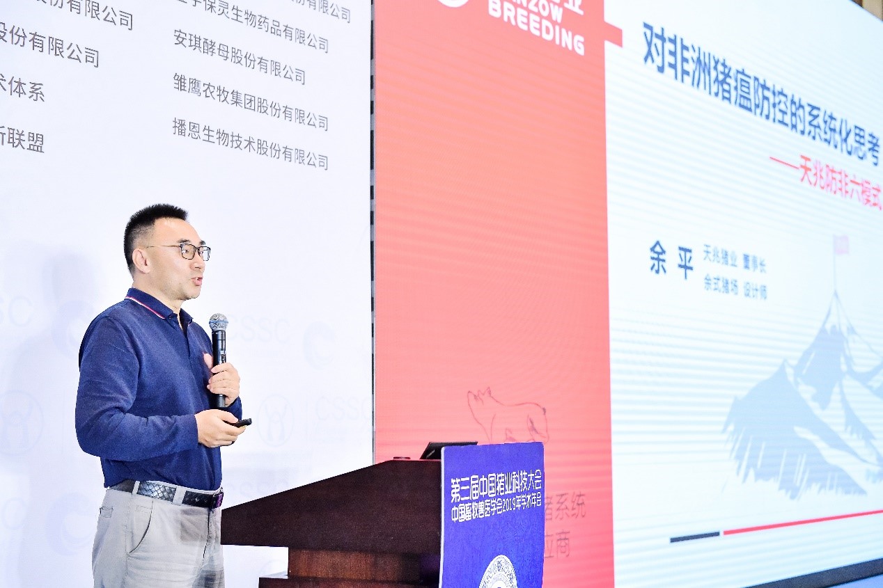 天兆豬業作為此次大會的發起人單位,對大會予以了全力支持。天兆豬業董事長余平在會上作了《對非洲豬瘟防控的系統化思考——天兆防非六模式》的主題報告,分享了在這場令養豬人談“非”色變的重大疫情中,作為養豬業的上游,種豬企業如何做好生物安全防控。