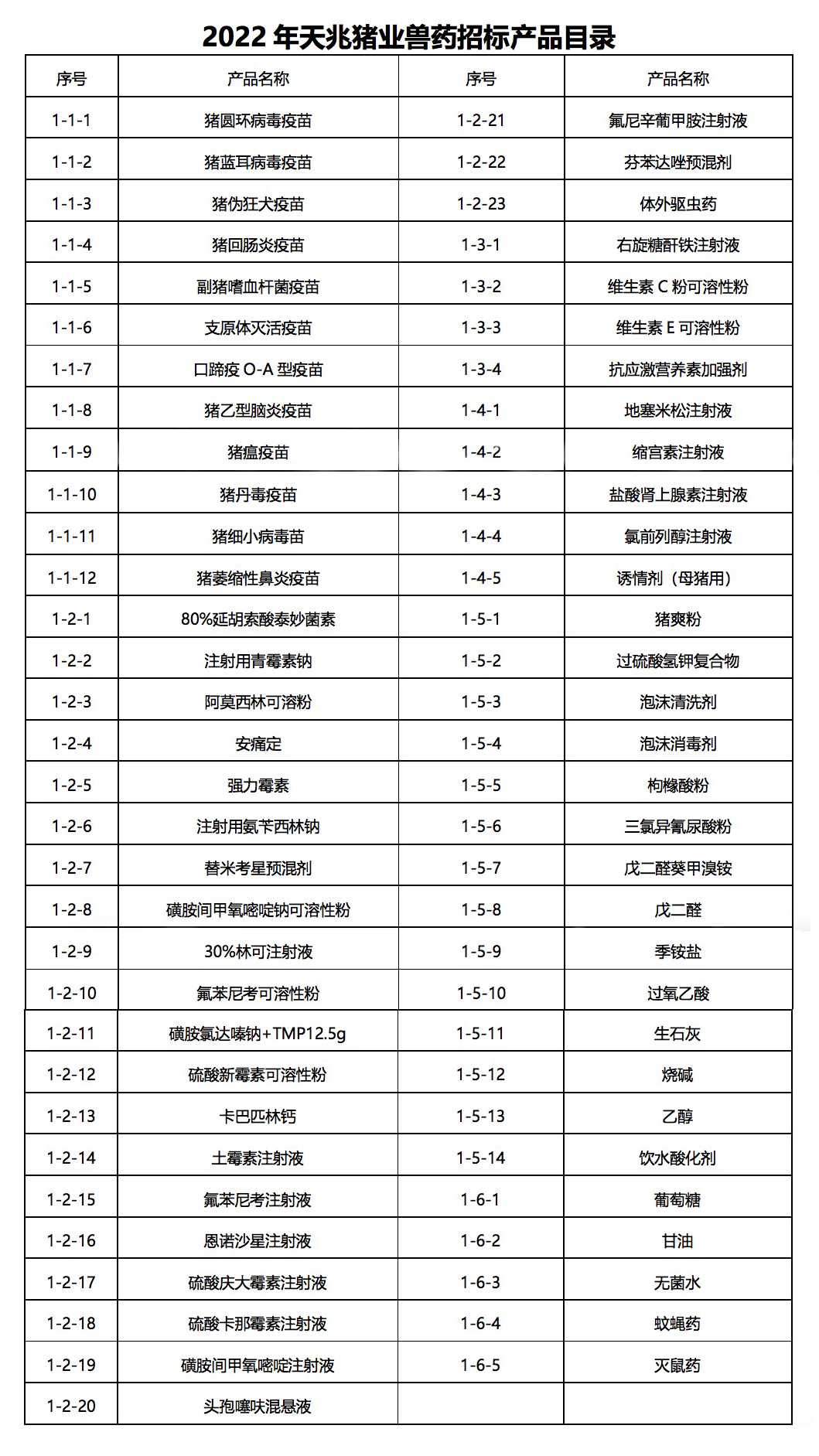 豬用疫苗、抗生素、消毒藥等豬場生產相關藥品。招標產品參見附件《2022年天兆豬業獸藥招標產品目錄》,但不僅限于附表。