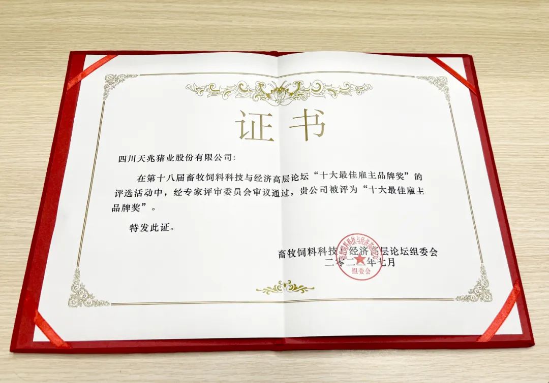 在論壇期間舉辦的頒獎盛典上,天兆豬業獲評“十大最佳雇主品牌獎”。