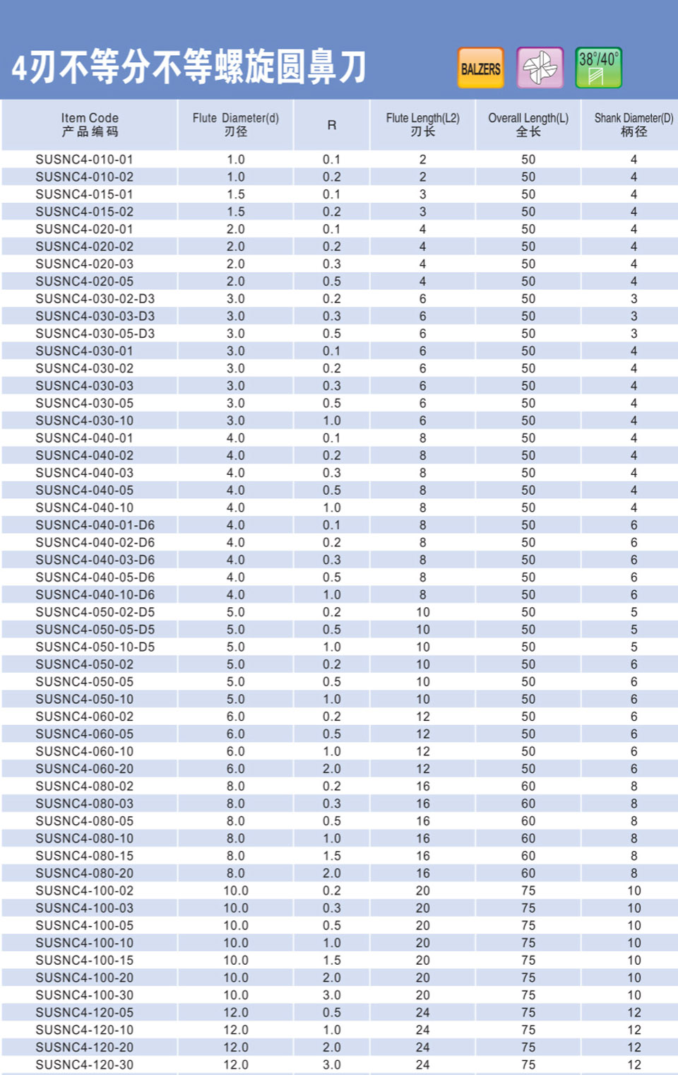 不等分不等螺旋加長圓鼻刀4刃