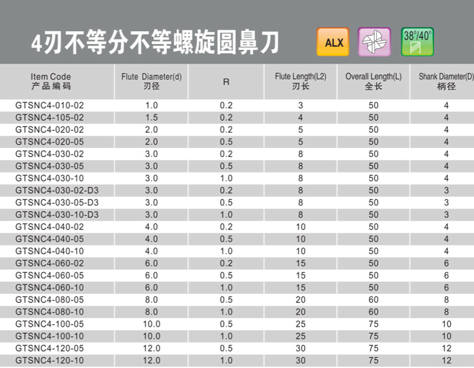 不等分不等螺旋加長圓鼻刀4刃